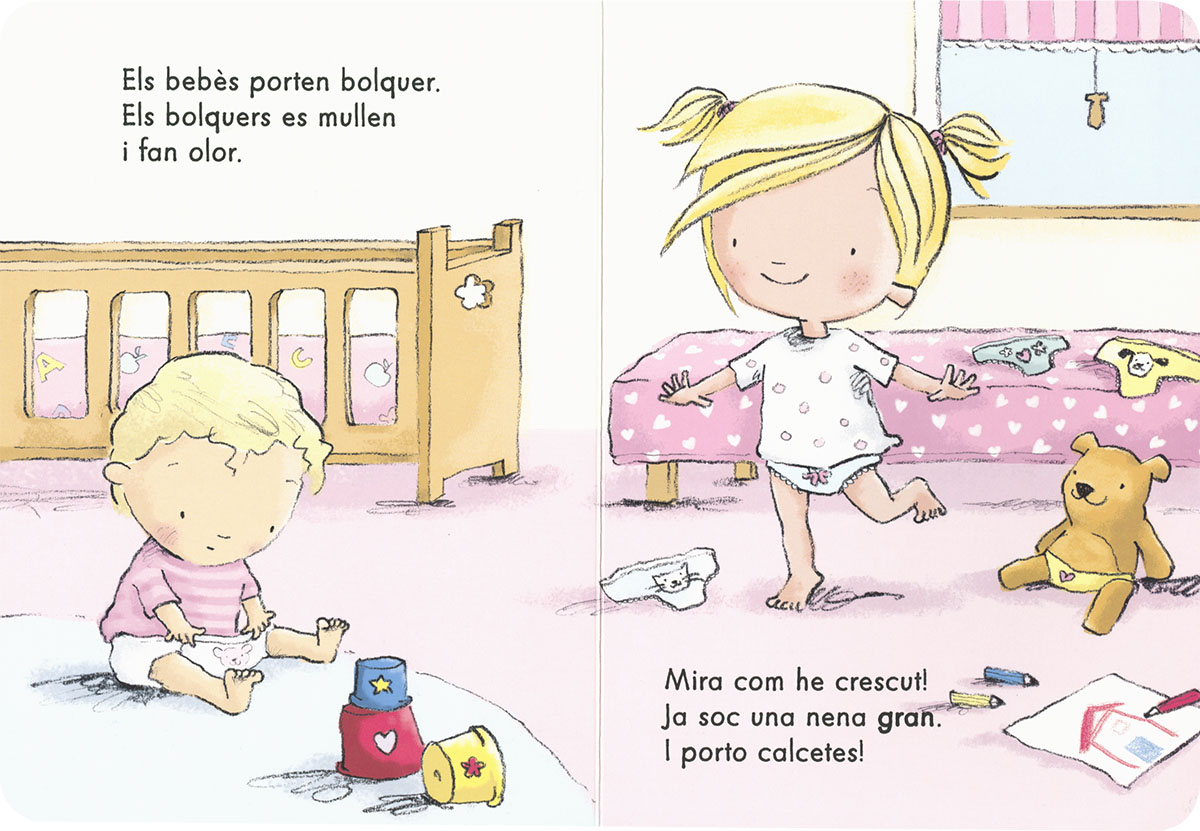 Quan els nadons es fan grans, ja no porten bolquers. Aquesta nena ha après a anar al lavabo tota sola! Amb l'ajuda de la mare i del pare, i d'aquest senzill mètode en sis passos, ha estat fàcil aconseguir-ho. Aquest lot conté una guia per als pares, elaborada per la psicòloga infantil Janet Hall, un conte il·lustrat i làmines amb adhesius.