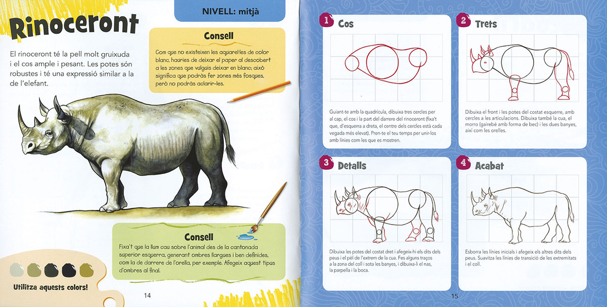 Aquesta senzilla guia conté instruccions que t'ensenyaran a dibuixar animals salvatges pas a pas, augmentant la complexitat a mesura que vagis progressant i adquirint les destreses necessàries per a convertir-te en un autèntic artista.