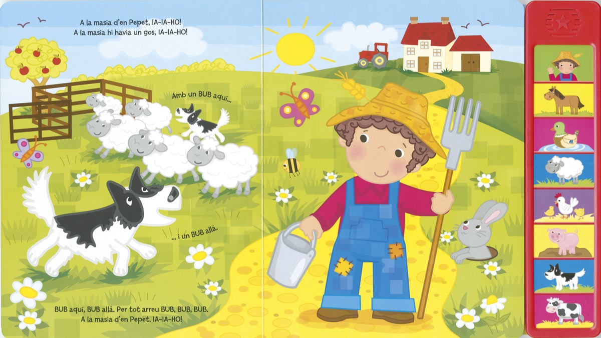 Segueix la lletra al ritme de la melodia i canta amb els animals de la masia. Podràs escoltar vuit sons diferents mentre t'ho passes molt bé passejant per aquesta masia tan divertida!