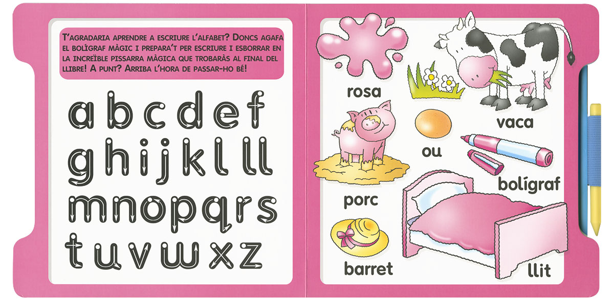 Aprèn a escriure l´abecedari i copia les paraules a la pissarra màgica. Per esborrar les lletres, només hauràs de tornar a introduir la pissarra al seu lloc. Desapareixeran com per art de màgia!