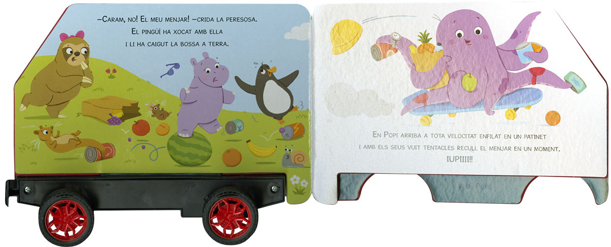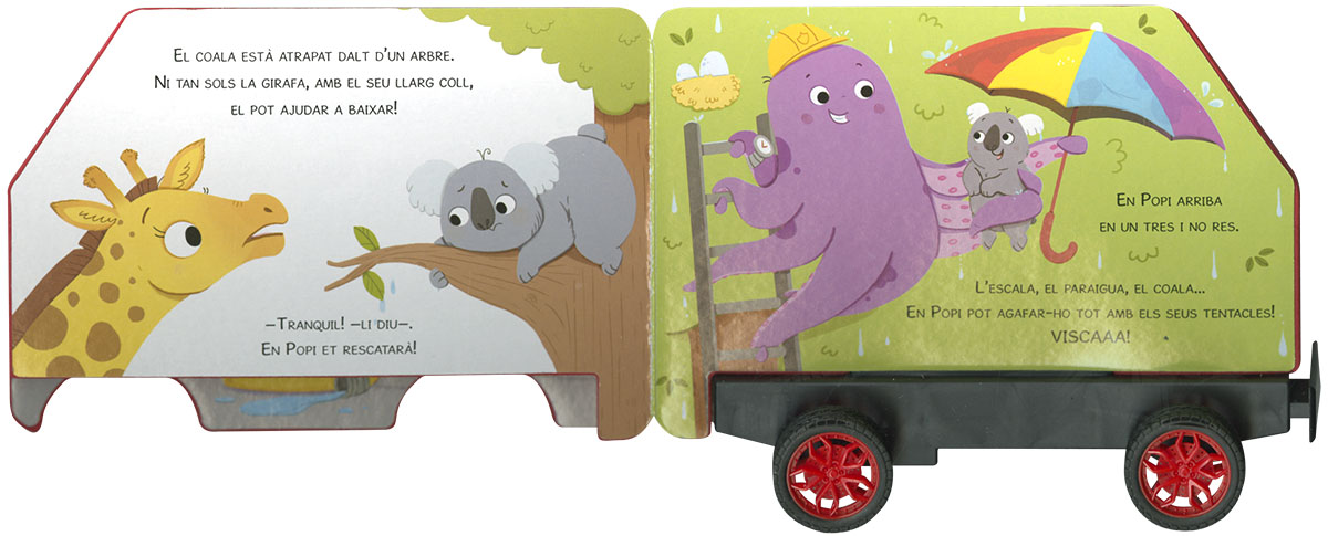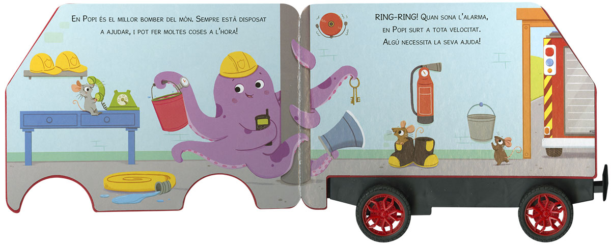 Hola, nens i nenes! Soc en Popi, el bomber. Voleu acompanyar-me avui? Llegirem les meves petites aventures i també jugarem amb el meu camió de bombers, perquè aquest llibre de goma escuma... té rodes! I si fem marxa enrere, el camió fins i tot rodarà sol quan el deixem anar. És un divertit llibre-joguina, ideal per als més petits de la casa!