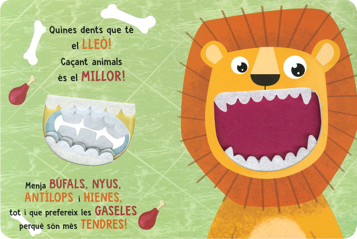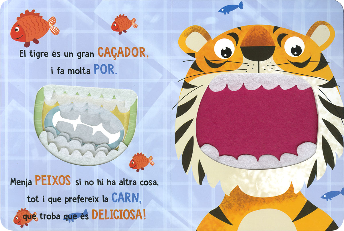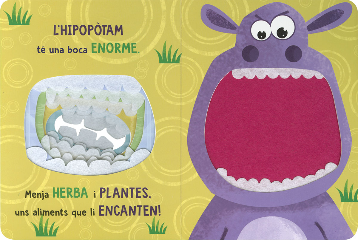 En aquest llibre hi ha animals molt diferents amb boques molt divertides. Què li agradarà menjar a cadascú? I qui té la boca més gran? Descobreix-lo ficant la mà entre les dents de roba i gaudeix d'aquest original llibre infantil de cartró.