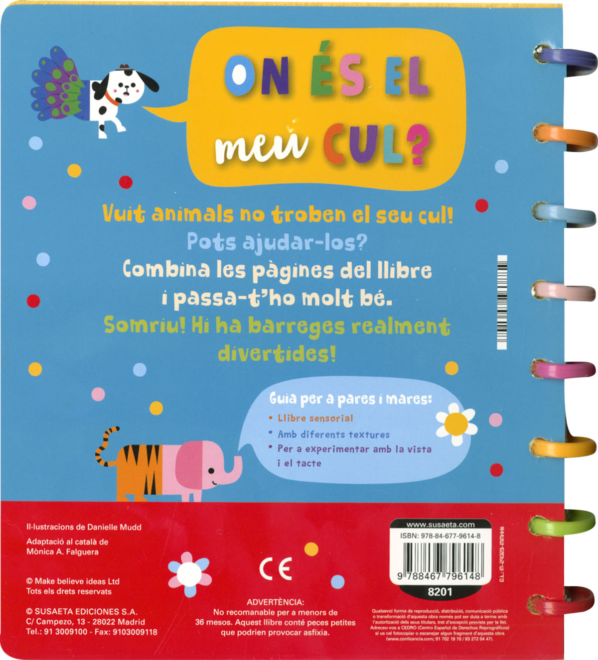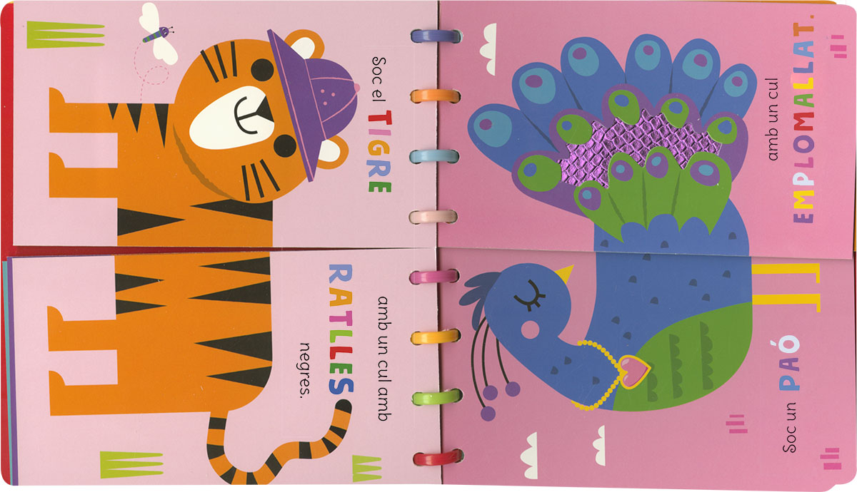 Aquest llibre de pàgines de feltre i de cartolina és un llibre molt esbojarrat... Vuit animals han perdut el seu cul. On deuen ser? Combina les meitats de les pàgines per a trobar-los. Tocant les textures de cada culet et serà més fàcil! I potser descobriràs nous animals divertits!