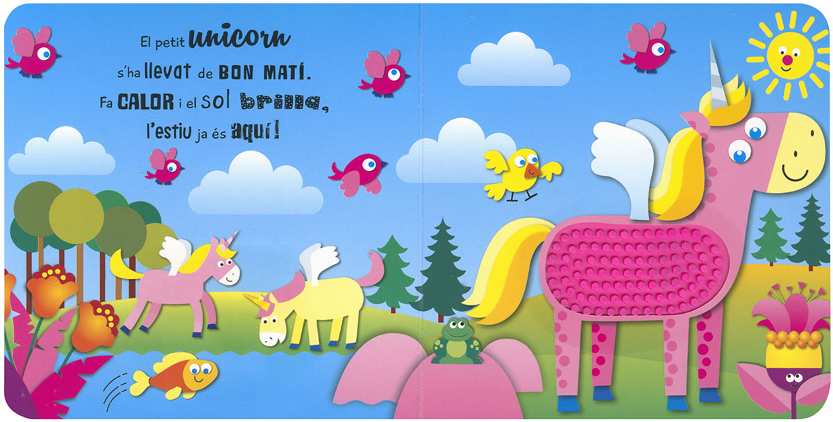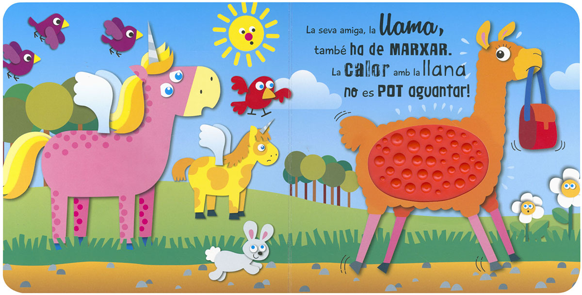 Apropa't als teus amics preferits i toca'ls. Què notes? És igual l'unicorn que la llama? Un llibre amb simpàtiques rimes i agradables textures per a tocar, divertir-se i experimentar.