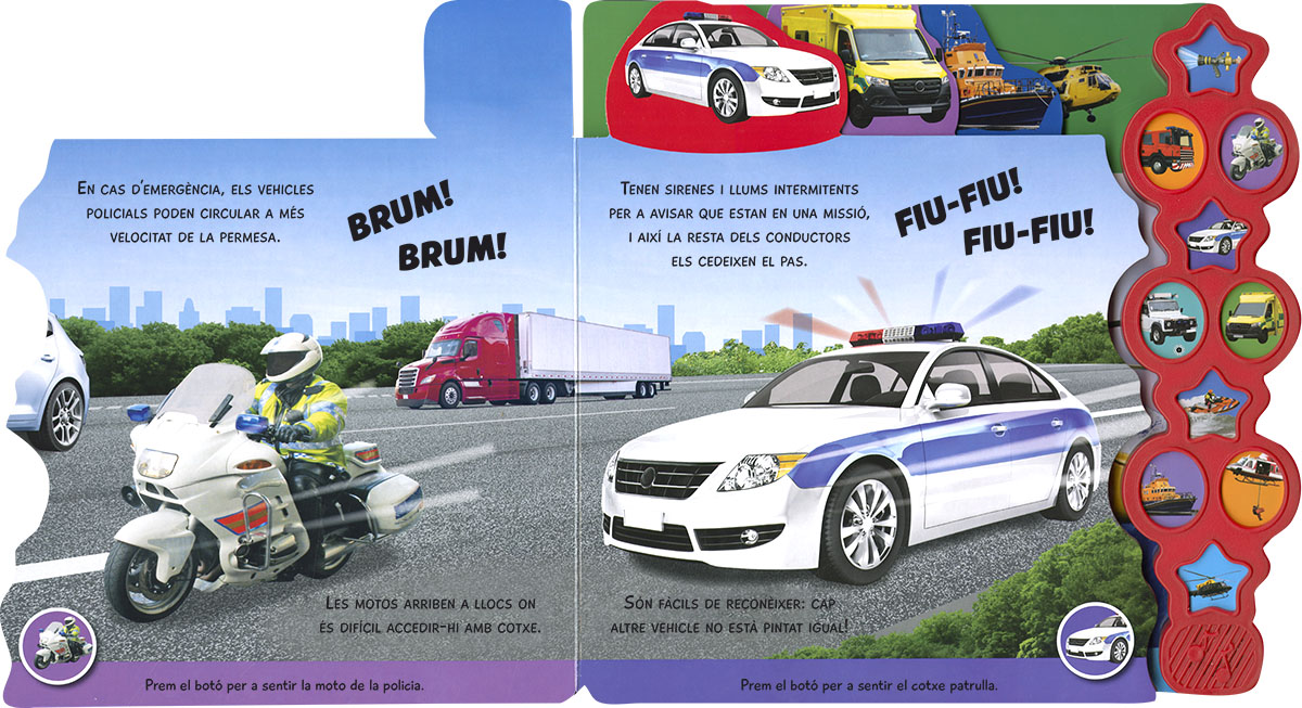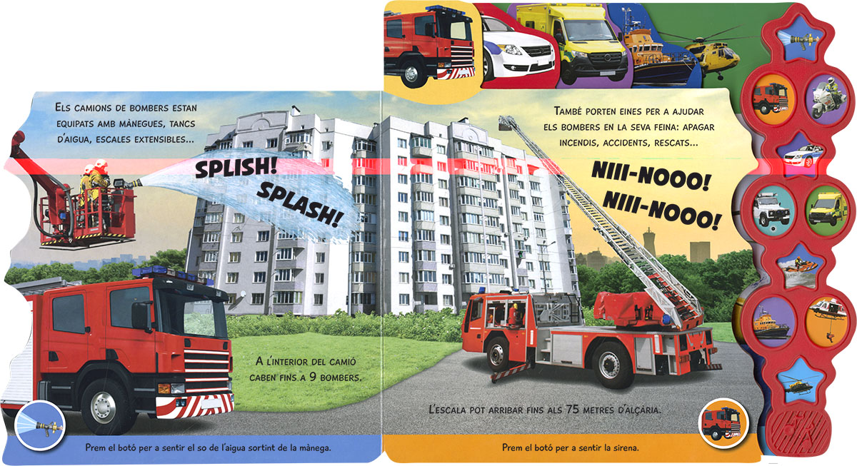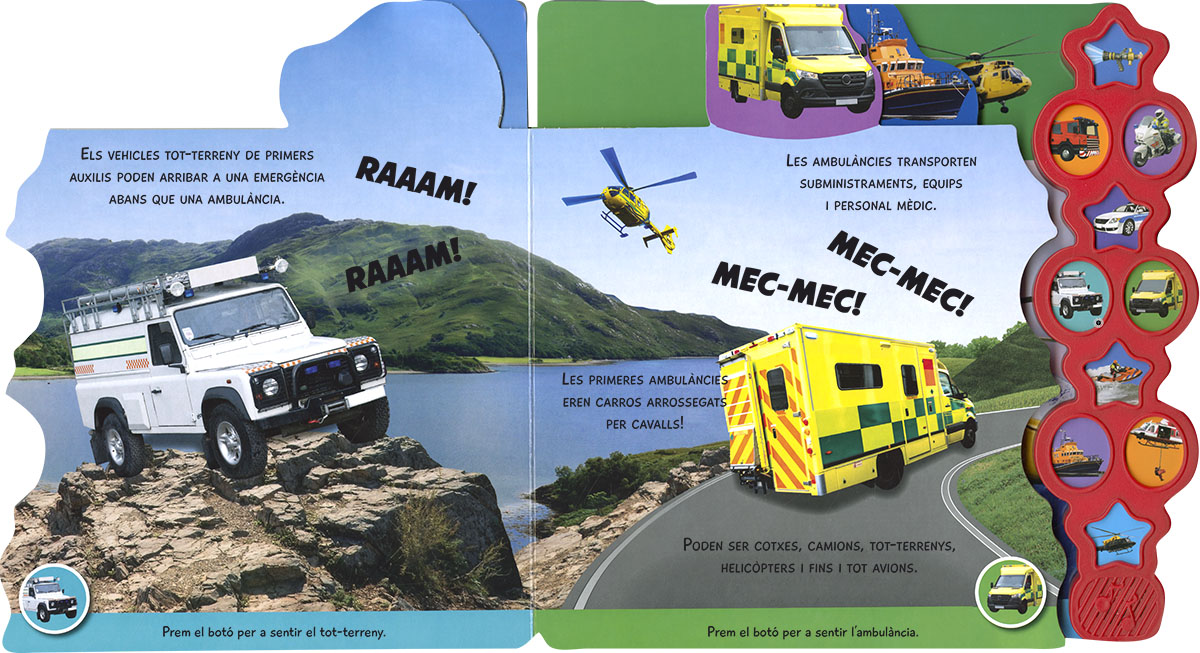Coneix tots els vehicles d?emergències i descobreix com ens ajuden en el dia a dia. Amb 10 sons i pestanyes de cartró per a passar les pàgines, aquest llibre és perfecte per a emocionar-te amb l?apassionant món dels rescats.