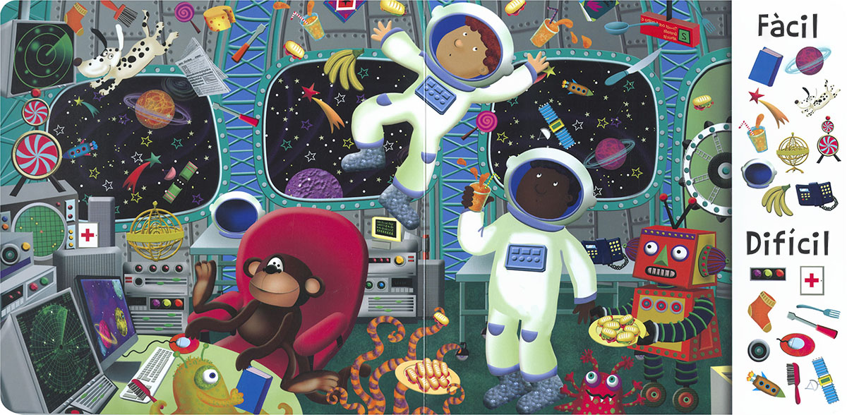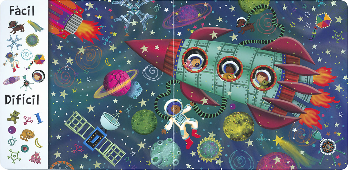 Obre les pàgines d?aquest SORPRENENT LLIBRE i busca a l?ESPAI un munt de PERSONATGES i d?OBJECTES. Alguns són més FÀCILS de trobar i d?altres una mica més DIFÍCILS. Vols intentar-ho?