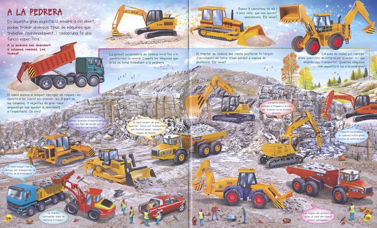 Un títol més d'aquesta col·lecció per aprendre i divertir-se buscant els nombrosos animals, persones i objectes de tot tipus que s'amaguen a les sorprenents il·lustracions. En aquesta ocasió, es tracta de conèixer millor l'apassionant món de les grans màquines: les del camp, de les obres, de la mineria, les de transport de maquinària pesant... i moltes més!