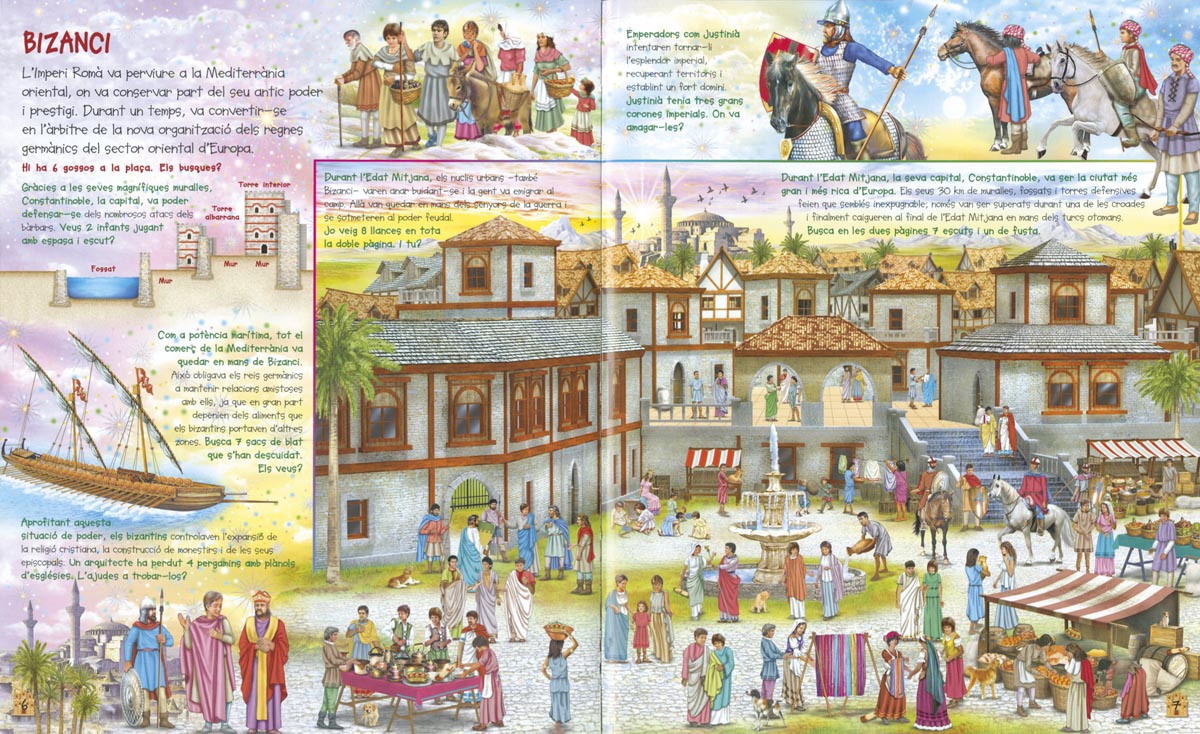 Un títol més d'aquesta col·lecció per aprendre i gaudir buscant els nombrosos animals, persones i objectes de tot tipus que s'amaguen en les seves sorprenents il·lustracions. Aquesta vegada es tracta de descobrir i aprendre coses sobre el món de l'Edat Mitjana: els senyors feudals, els grans banquets, el comerç, la cultura, la forma de vida i moltes coses més. Tot un desafiament!