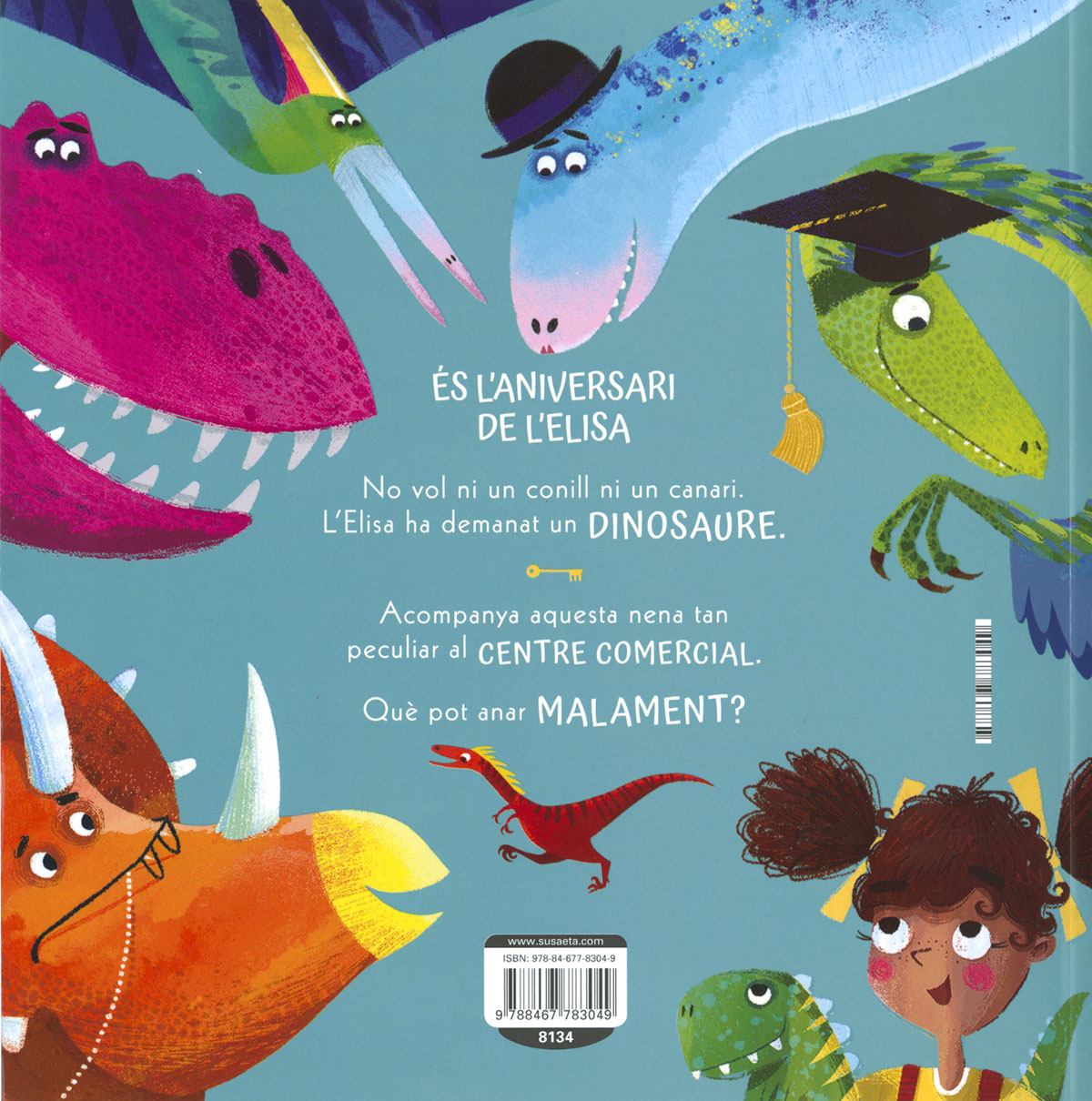 Alguna vegada has vist dinosaures en un centre comercial? Doncs ara els veuràs, perquè és l'aniversari de l'Elisa i no ha demanat ni un conillet ni un canari... Ha demanat un dinosaure! Un llibre en rima molt divertit i amb unes il·lustracions fantàstiques.