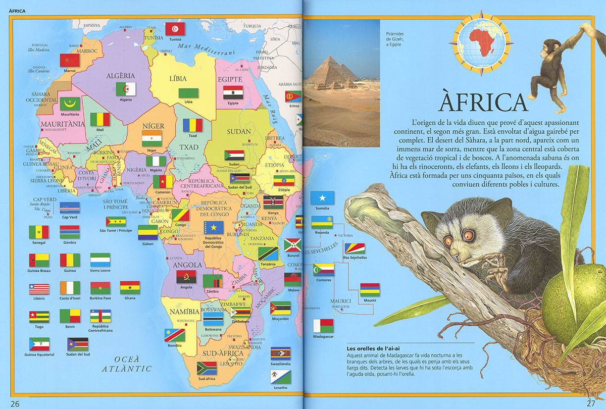 En aquest Atles dels Animals descobriràs, i localitzaràs en els mapes, la fauna característica de cada continent, quins animals viuen en els diferents països del món, i el seu hàbitat: boscos, muntanyes, sabanes, zones polars o deserts. Així mateix, trobaràs globus terraqüis per a situar els diferents continents, i mapes polítics per a identificar els països que hi ha en cadascun, juntament amb la seva bandera. Que tinguis un bon viatge!