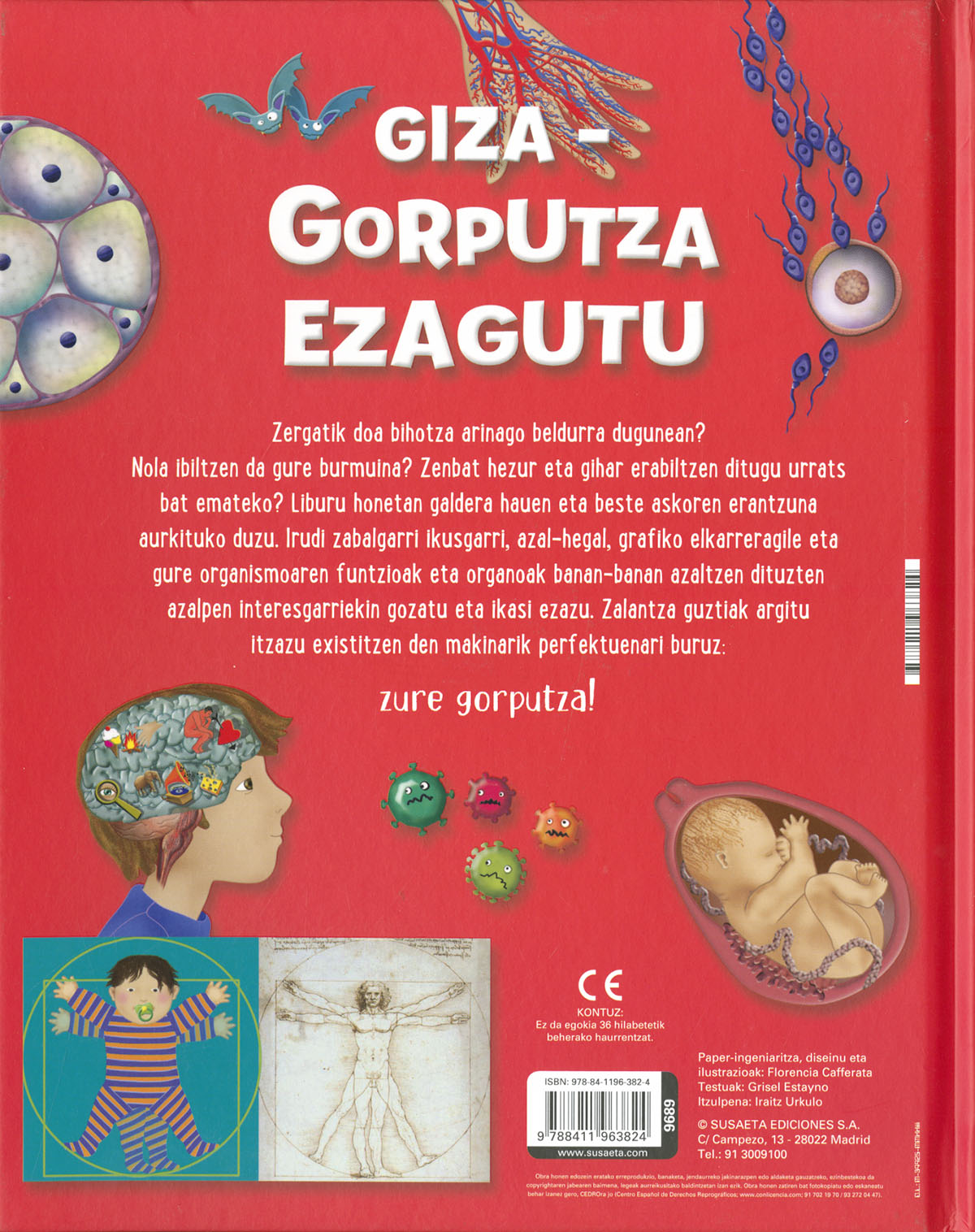 Nola ibiltzen da gure burmuina? Zenbat hezur eta gihar erabiltzen ditugu urrats bat emateko? Liburu honetan galdera hauen eta beste askoren erantzuna aurkituko duzu. Irudi zabalgarri ikusgarri, azal-hegal, grafiko elkarreragile eta gure organismoaren funtzioak eta organoak banan-banan azaltzen dituzten azalpen interesgarriekin gozatu eta ikasi ezazu. Zalantza guztiak argitu itzazu existitzen den makinarik perfektuenari buruz: zure gorputza!