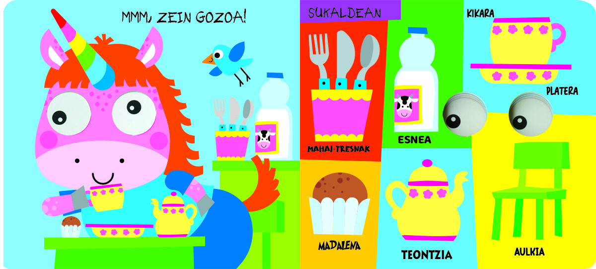 Azala:  Cartón plastificado brillo y troquelado con ojos móviles