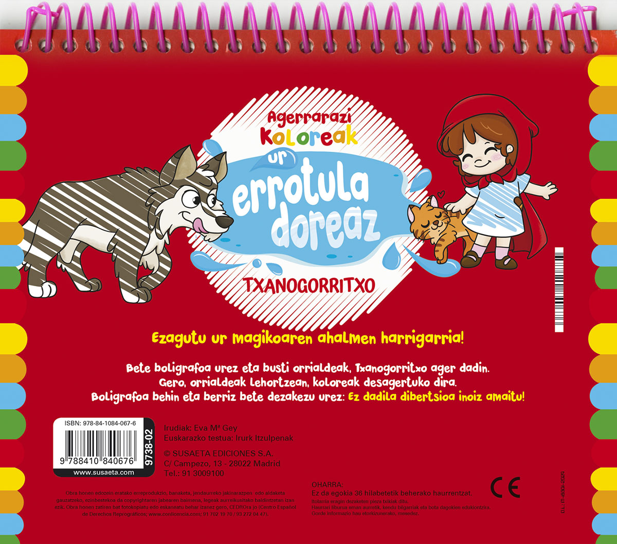 Ezagutu ur magikoaren ahalmen harrigarria! Bete boligrafoa urez eta busti orrialdeak, Txanogorritxo ager dadin. Gero, orrialdeak lehortzean, koloreak desagertuko dira. Boligrafoa behin eta berriz bete dezakezu urez: Ez dadila dibertsioa inoiz amaitu!