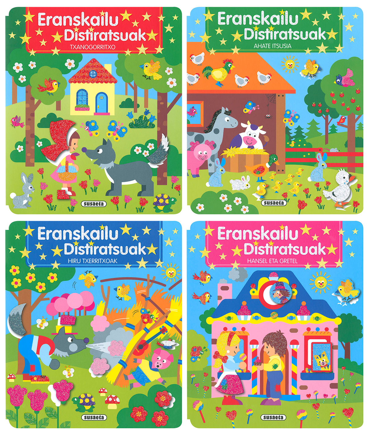 Bilduma honetako liburuek eranskailu ugari dakartzate: hegazkinak, helikopteroak, makinak, traktoreak, motoak... Horiek nahi beste aldiz itsatsiz eta kenduz, istorio harrigarriak sortu ahalko dituzu.