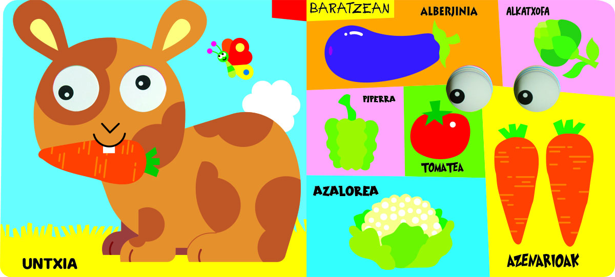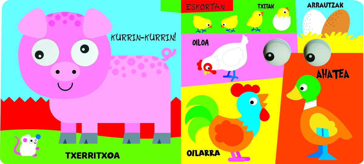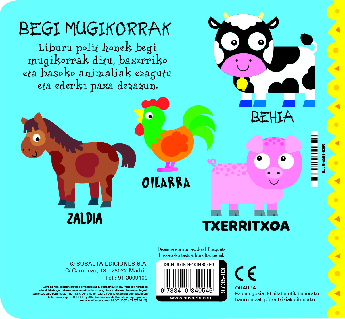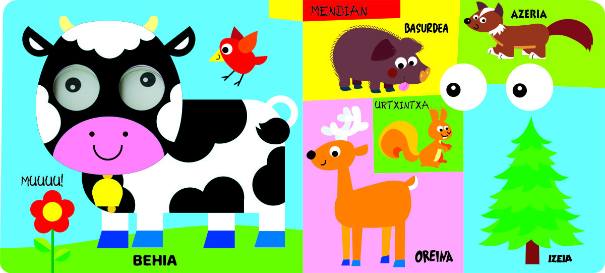 Liburu polit honek begi mugikorrak ditu, baserriko eta basoko animaliak ezagutu eta ederki pasa dezazun.