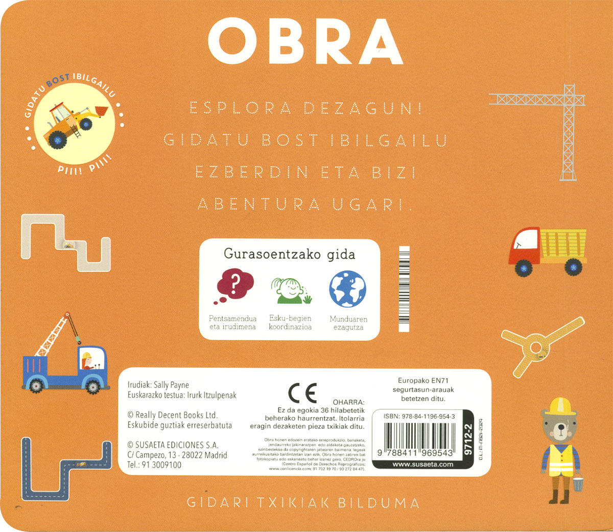 Masadera-ibilgailu bat gidatu nahiko zenuke? Eta hondeamakina bat? Kartoizko liburu honetan hori guztia egin ahalko duzu: mugitu diskoa seinalatutako bidetik eta ikasi ibilgailu bakoitzari buruzko kontu ugari. Bost ibilgailu ezberdin gidatuko dituzu!