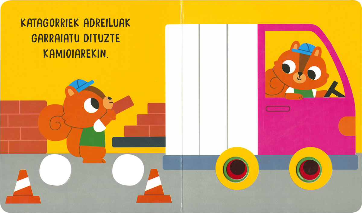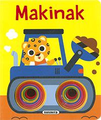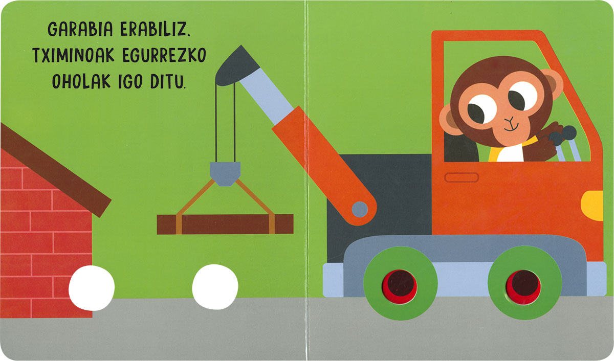 Ba al dakizu obra batean zertarako erabiltzen den makina bakoitza? Kartoizko liburu trokelatu honetako animaliek erakutsiko dizute, marrazki koloretsuek lagunduta.