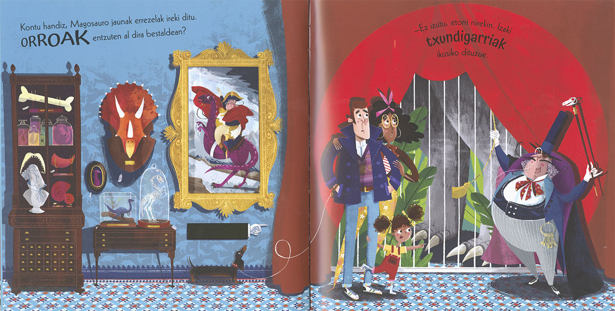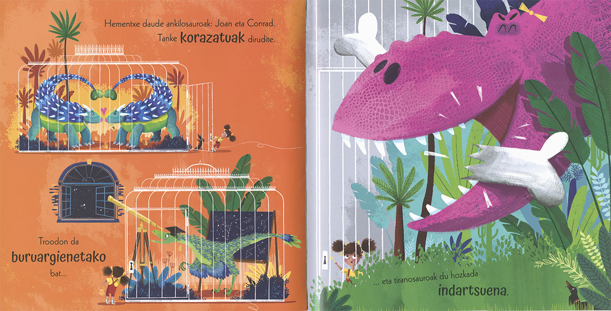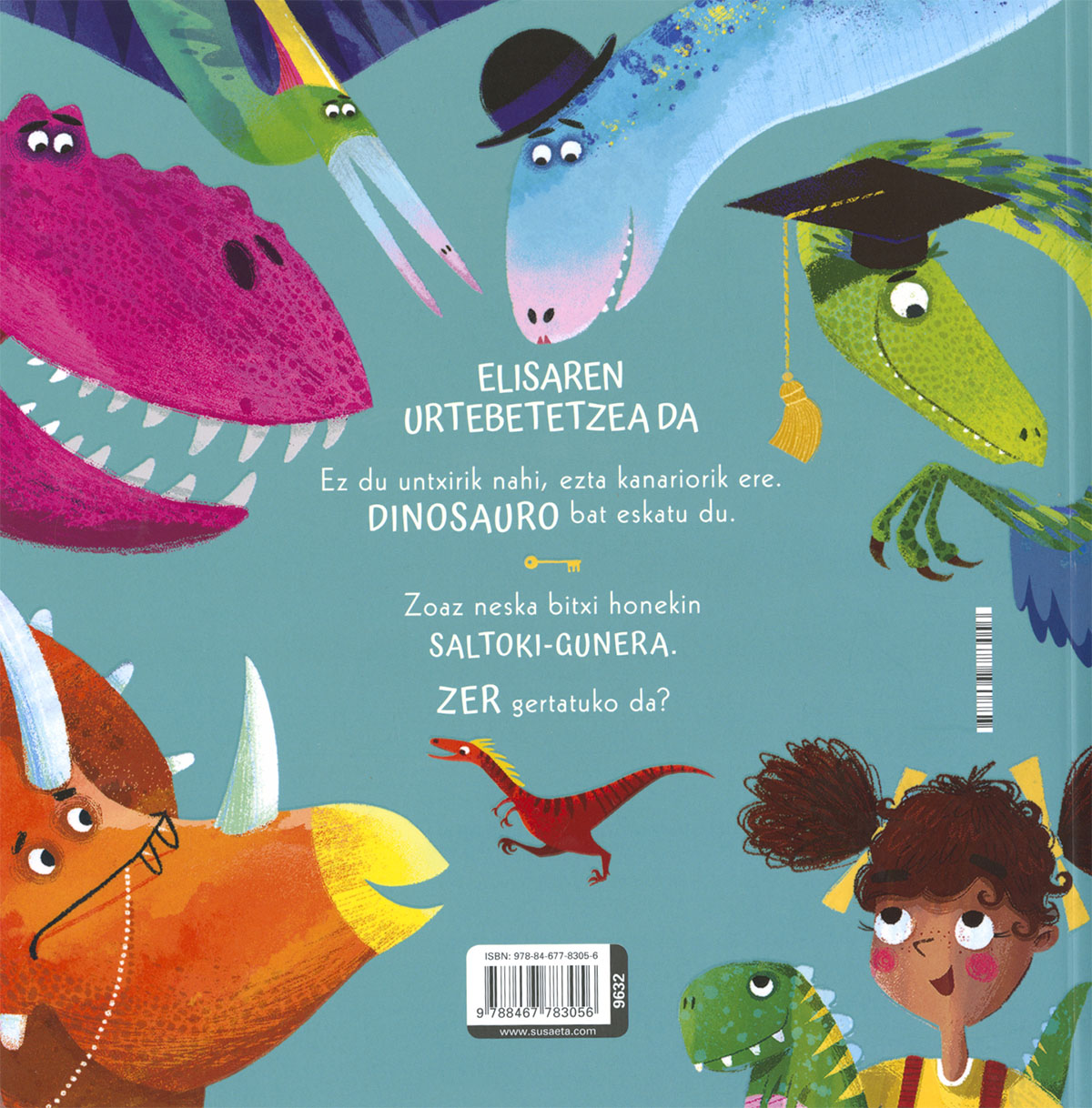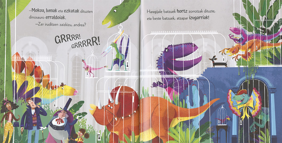 Ikusi al duzu inoiz dinosaurorik saltoki-gune batean? Bada, egon adi. Gaur Elisaren urtebetetzea da. Ez du untxirik nahi, ezta kanariorik ere. DINOSAURO bat eskatu du! Oso liburu dibertigarria da, eta irudi zoragarriak ditu.