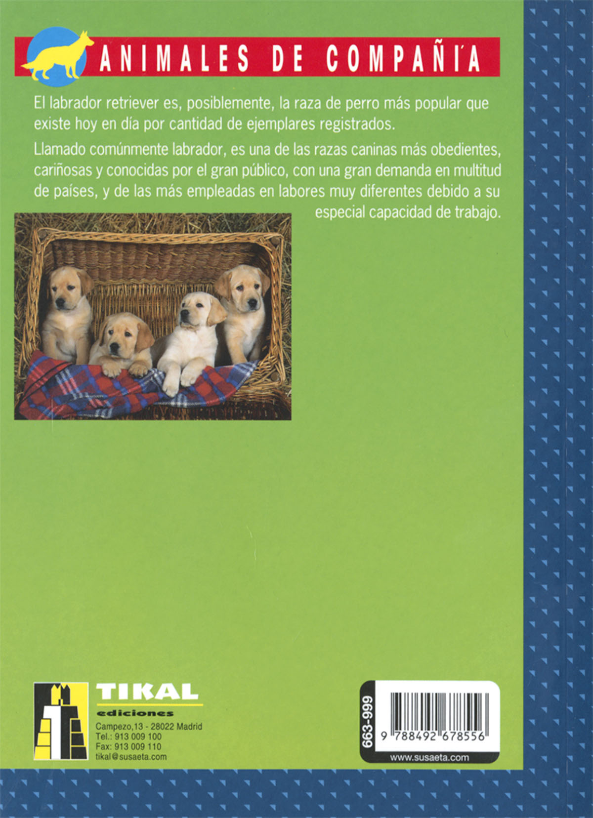 Llamado sencillamente labrador, es una de las razas caninas más obedientes, cariñosas y conocidas por el gran público, con una gran demanda en todos los países, y de las más empleadas en labores muy diferentes debido a su especial capacidad de trabajo. En este libro encontrará todo lo que le puede resultar interesante y necesita para disfrutar de su querido amigo de cuatro patas: historia, adiestramiento, alimentación, enfermedades, cuidados, parto, cría...