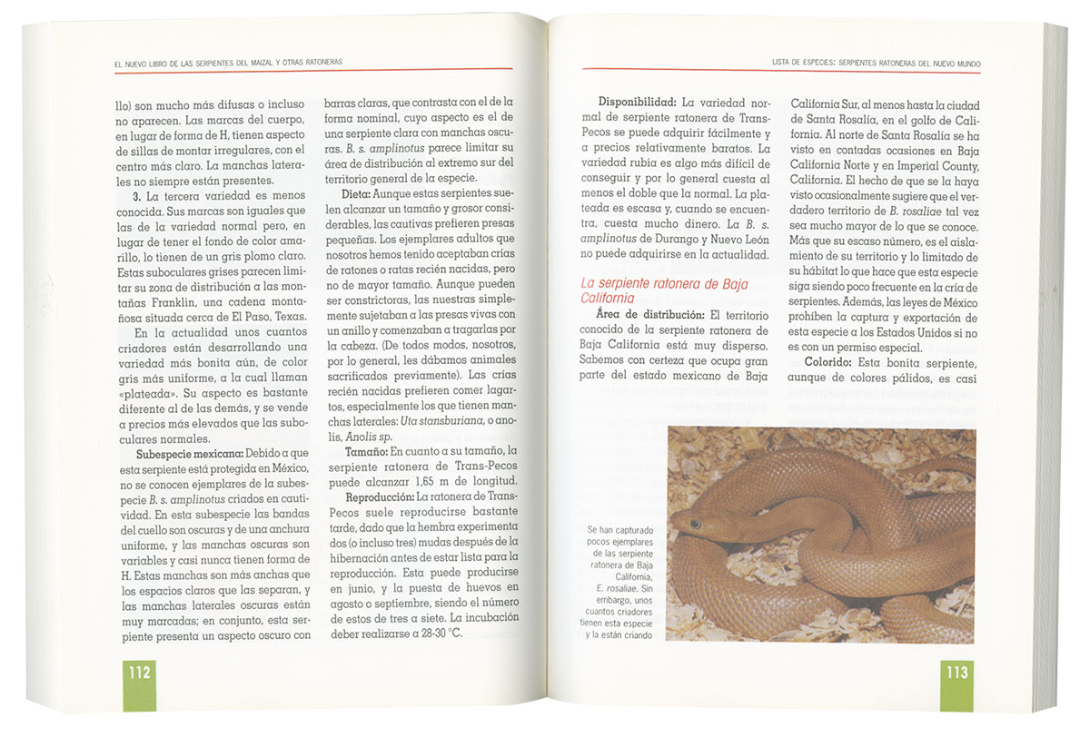 Las serpientes ratoneras en general, y las del maizal en particular, se han convertido en eje de una actividad comercial dedicada a las serpientes como animales de compañía que afortunadamente, gracias a la profesionalidad de los criadores, no ha supuesto perjuicio para las poblaciones silvestres. En este libro se explica todo lo que hay que saber para adquirir, mantener, cuidar y criar serpientes del maizal.