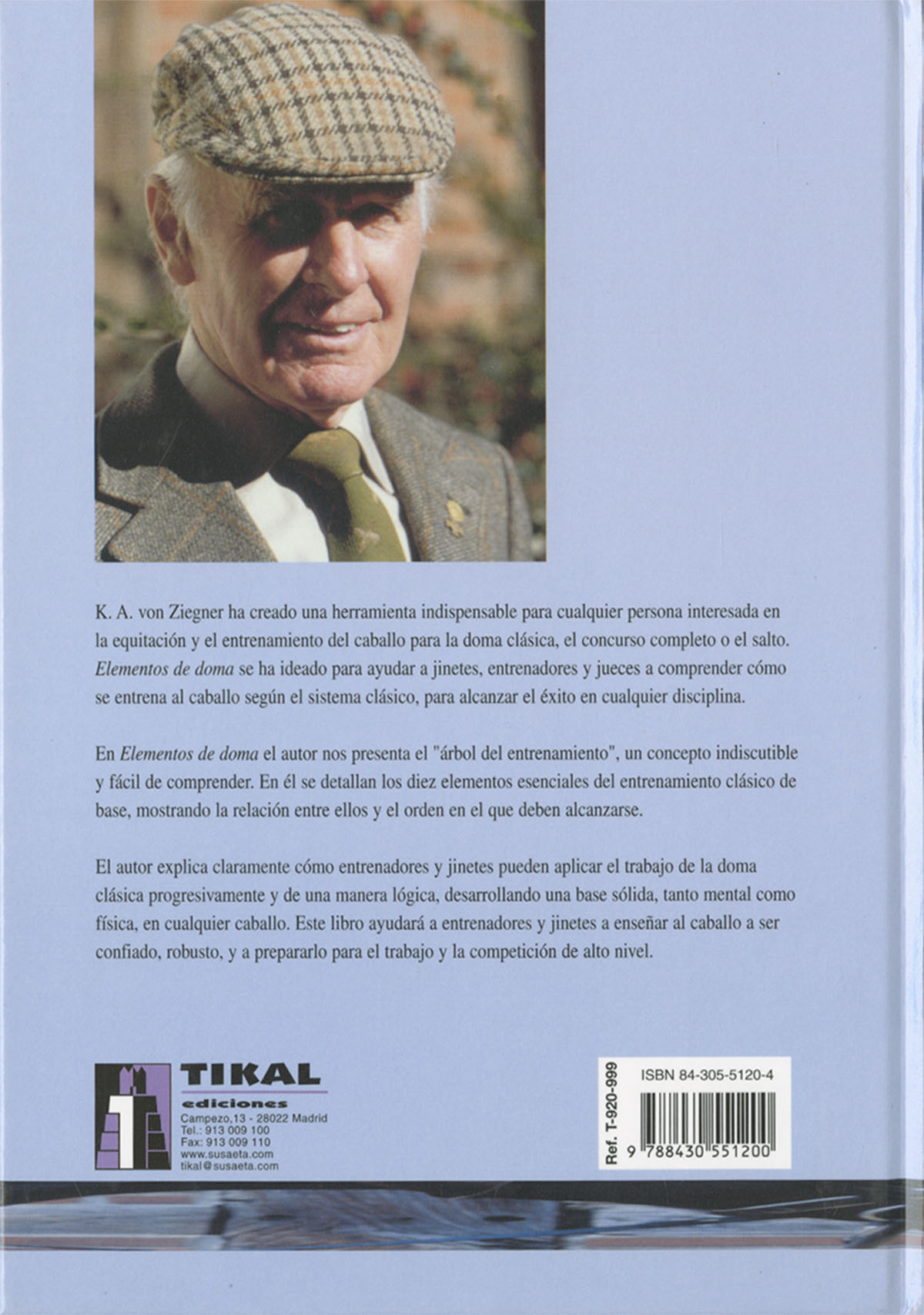 K. A. von Ziegner ha creado una herramienta indispensable para cualquier persona interesada en la equitación y el entrenamiento del caballo para la doma clásica, el concurso completo o el salto. El autor nos detalla los diez elementos esenciales del entrenamiento clásico de base, mostrando la relación entre ellos y el orden en el que deben alcanzarse. Este libro ayudará a entrenadores y jinetes a enseñar al caballo a ser confiado, robusto, y a prepararlo para el trabajo y la competición de alto nivel.