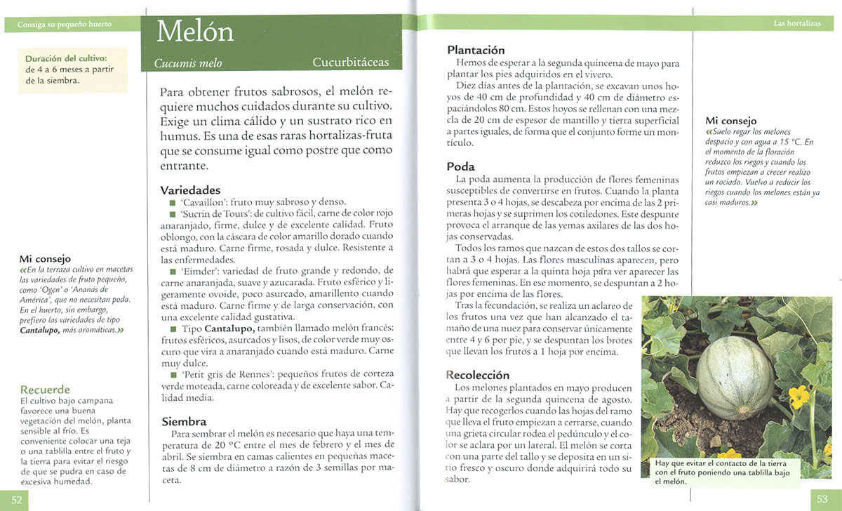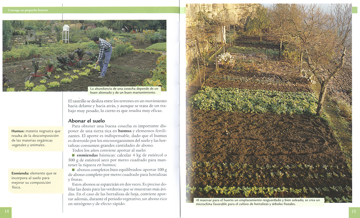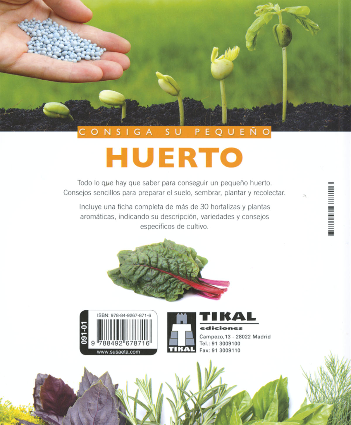 Todo lo que hay que saber para conseguir un pequeño huerto. Consejos sencillos para preparar el suelo, sembrar, plantar y recolectar. Incluye una ficha completa de más de 30 hortalizas y plantas aromáticas, indicando su descripción, variedades y consejos específicos de cultivo.