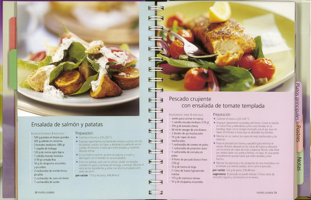Encuadernación:  Cartoné con cubierta plastif., interior en espiral con separadores, guarda recetas y cierre con goma