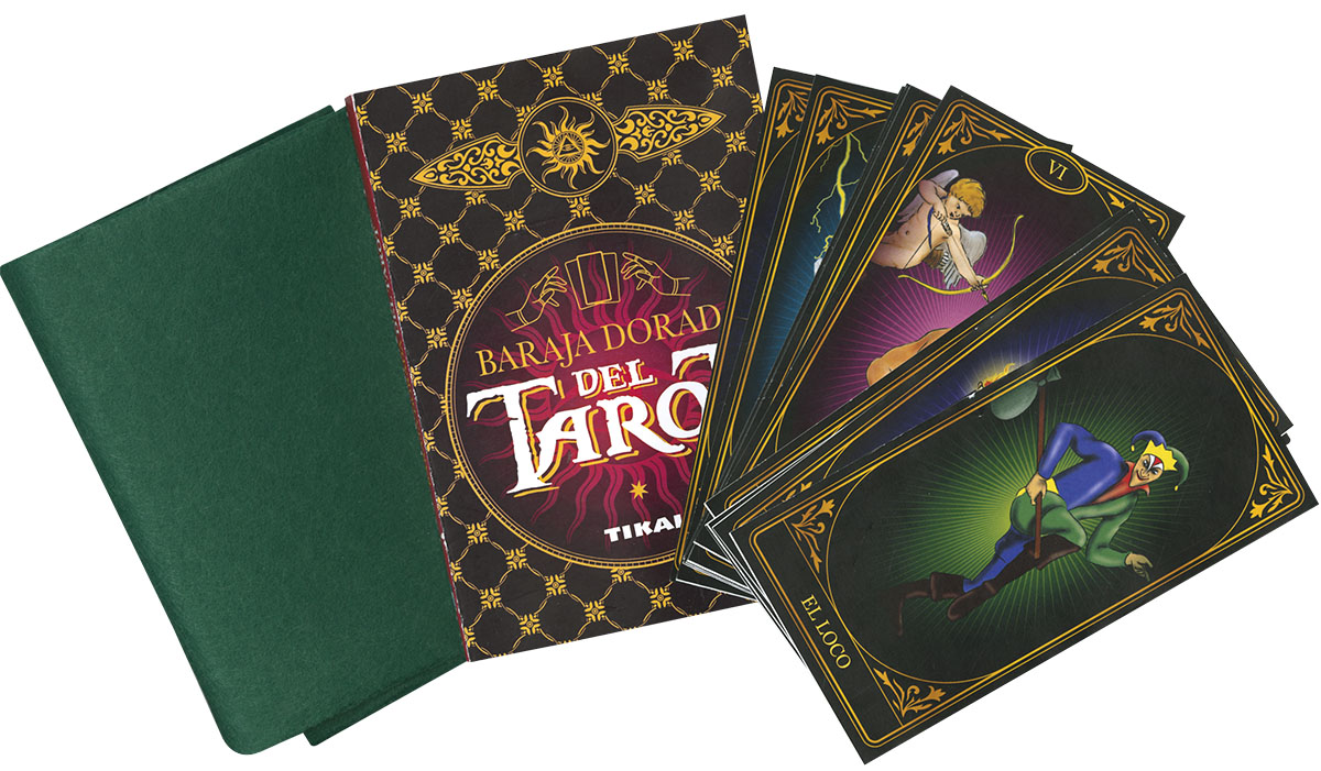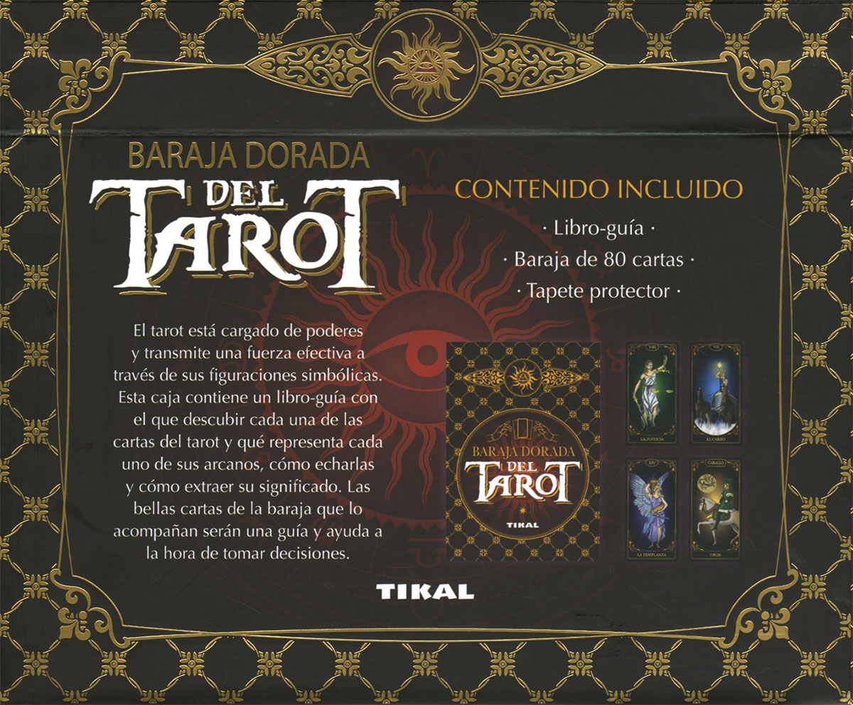 Encuadernación:  Caja de cartón plastificado mate con estampación, cont. libro, baraja de 80 cartas y tapete