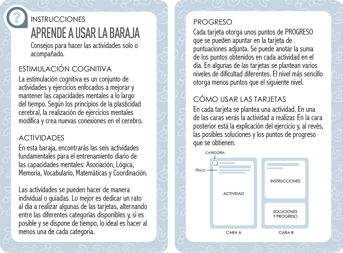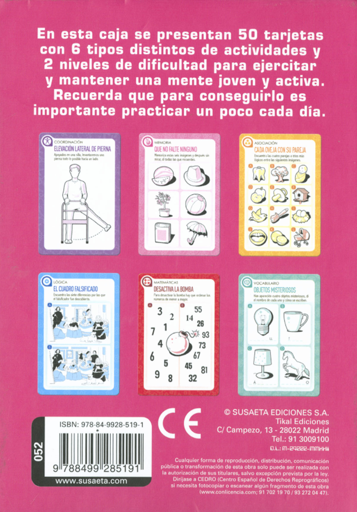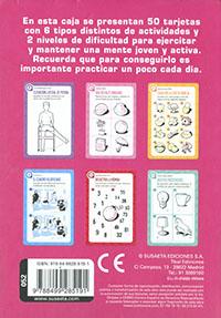 En esta caja se presentan 50 tarjetas con seis tipos de actividades y dos niveles de dificultad para ejercitar y mantener una mente joven y activa. Recuerda que para conseguirlo es importante practicar un poco cada dĂ­a.