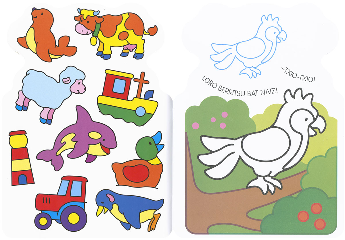 Probatu zure artista gaitasunak eta margotu liburu honetako animaliak; nahi dituzun koloreak erabil ditzakezu, edo barrualdean topatuko dituzun eranskailuen ereduari jarraitu.
