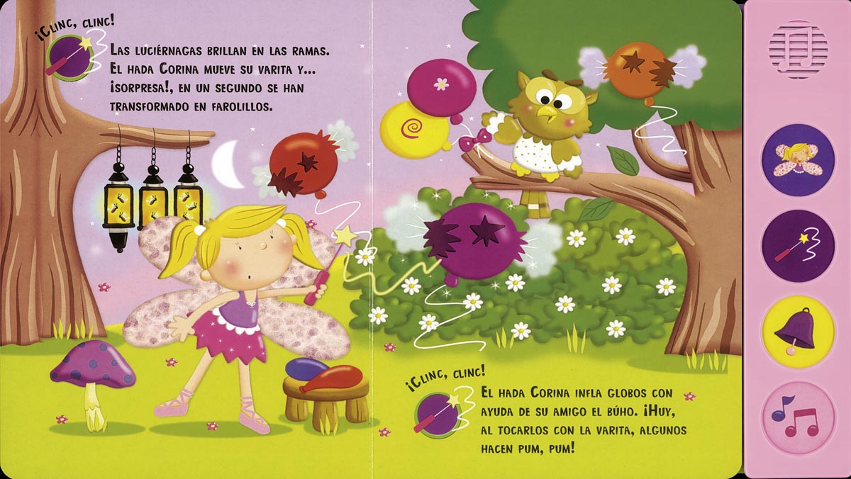 El hada Corina y sus amigas, las hadas risueñas, están preparando una gran fiesta. Pulsa los botones y escucha los divertidos sonidos del bosque encantado donde viven las hadas de este encantador libro.