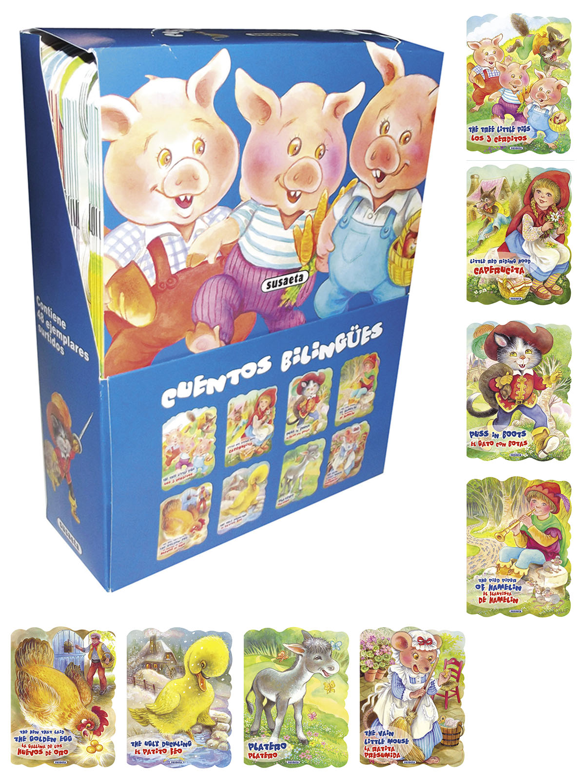 Los clásicos de siempre en edición bilingüe para aquellos niños que quieren hablar el inglés y el español igual de bien: Los tres cerditos, Caperucita, El gato con botas, El flautista de Hamelin, La gallina de los huevos de oro, El patito feo, La ratita presumida y Platero.
