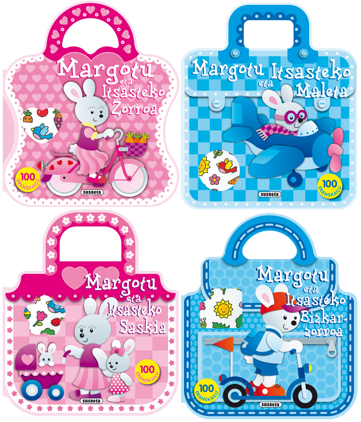 Azala:  Kartoi laminatua, purpurinarekin, heldulekua, pegatinak barrualdean. 4 aleko sortatan aurkeztua.