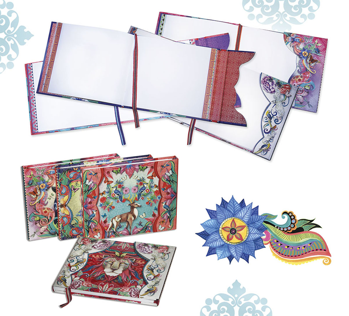 Encuadernación:  Cartoné plastificado mate y brillo con relieve, cierre magnético y cinta marcapág.con bordado étnico