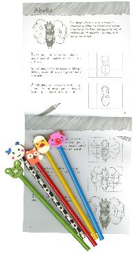 Enquadernació:  Cartolina plastificada brillantor i encunyat amb 5 llapis de colors i 5 gomes d'esborrar