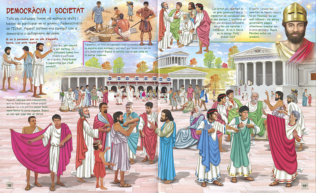 Un títol més d'aquesta col·lecció per a aprendre i gaudir buscant els nombrosos animals, persones i objectes de tot tipus que s'amaguen en les seves sorprenents il·lustracions. Aquesta vegada, coneixerem molt millor l'origen i els primers habitants de l'Antiga Grècia, els mites i les seves llegendes, les ciutats més importants, els Jocs Olímpics, la societat, l'educació? i moltes coses més!
