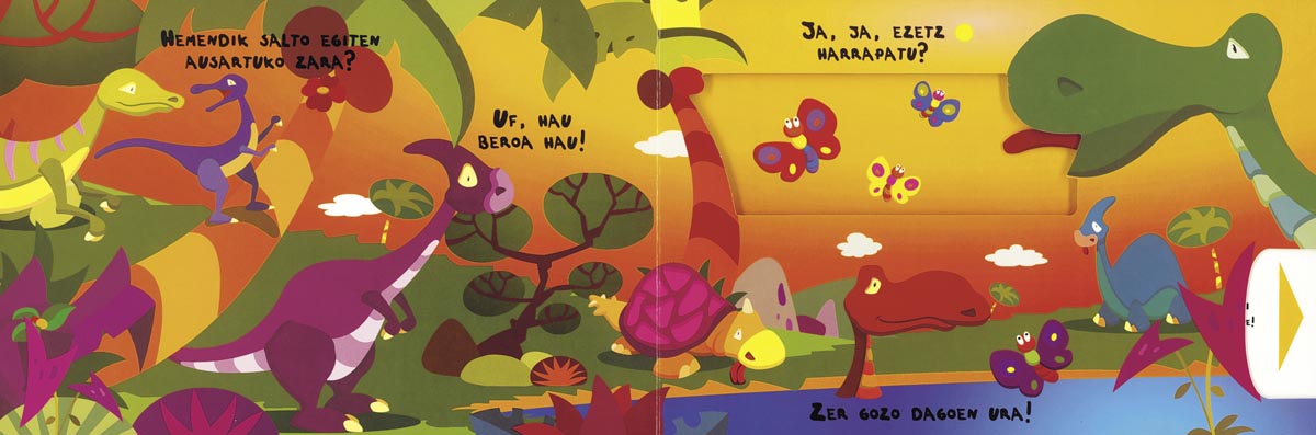 Liburu zoragarri honetan, irakurleak sorpresaz sorpresa ibiliko dira, paperezko mekanismoa eta kolore biziko ilustrazioak direla eta. Irakurle txikienek irakurketaz eta dinosauroez gozatzeko moduko liburua da, testua letra larriz idatzita eta marrazki politez lagunduta baitago.