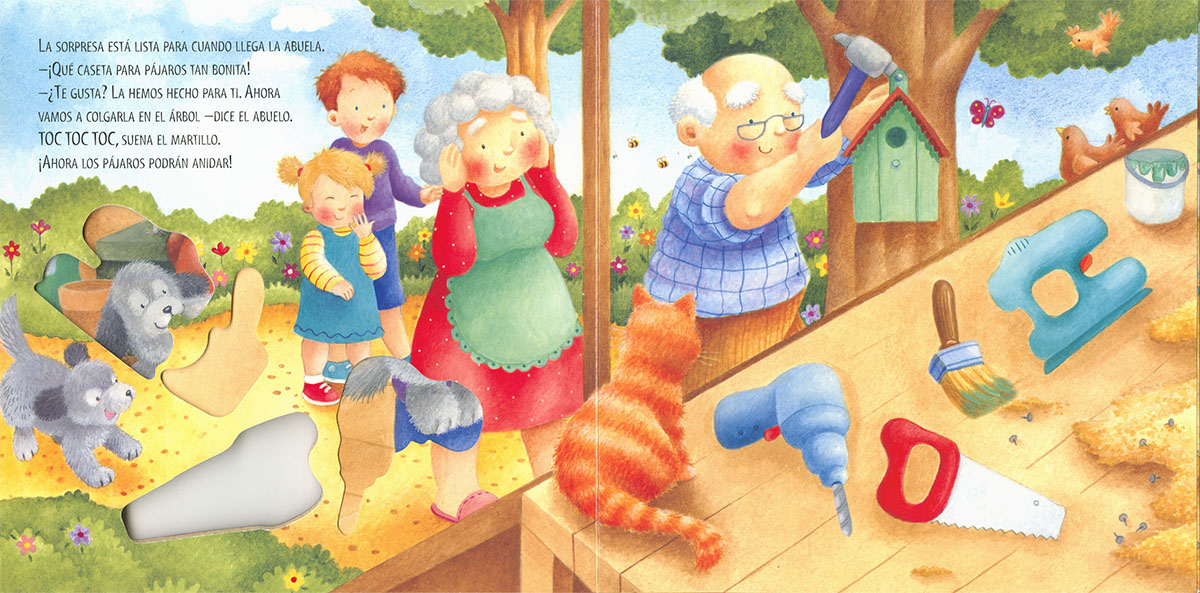 El abuelo está construyendo una caseta para pájaros. Entra en su taller junto a sus nietos y descubre qué herramientas utiliza y qué ruido hace cada una. Un libro muy divertido, con una simpática historia para que los pequeños lectores se diviertan leyendo y escuchando cada vez que aprietan el botón cómo suenan las herramientas.