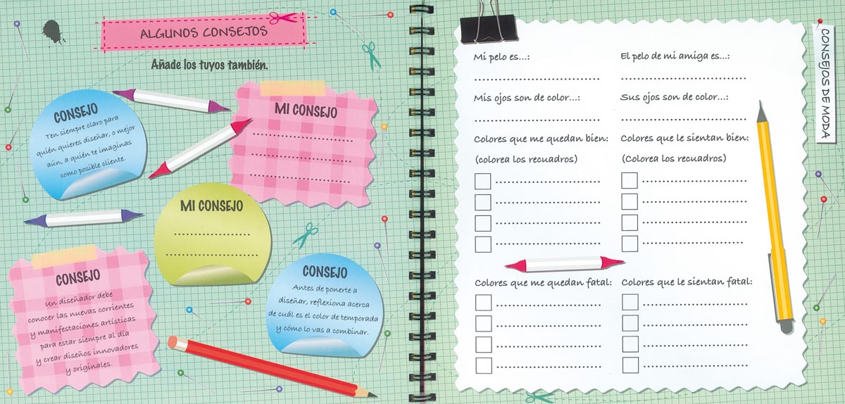 Has pensado en convertirte en diseñadora de moda? Haz tu gran aportación a este glamuroso mundo con novedosas y arriesgadas ideas y déjalas plasmadas en este especial diario. En él podrás hacer tus bocetos, diseñar bolsos y zapatos, confeccionar vestidos para distintas fiestas y eventos y elaborar listas con todo lo que necesitas en tu costurero. Averiguarás también qué estilos son los que mejor te sientan, cuáles son tus diseñadores favoritos o los vestidos más bonitos e inspiradores de las celebridades. Utiliza, además, las pegatinas para decorar y personalizar tus diseños. ¡El mundo de la moda te espera en el interior de este diario!