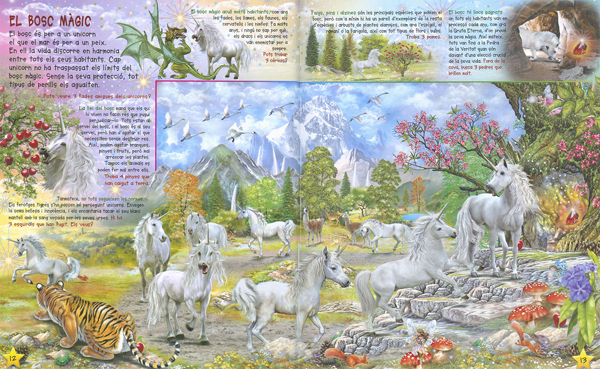 Qui hagi passejat per un bosc, caminant sense rumb, en silenci, haurà vist passar una ombra fugaç que apareix i desapareix en un sospir. És molt probable que s?hagi creuat amb un unicorn. Coneix aquests animals màgics i posa a prova la teva capacitat visual buscant a les pàgines del llibre els nombrosos elements que hi ha amagats.