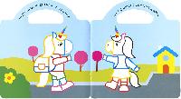 Encuadernación:  Cartulina plastificada mate, troquelada con asa y purpurina, interior con pegatinas