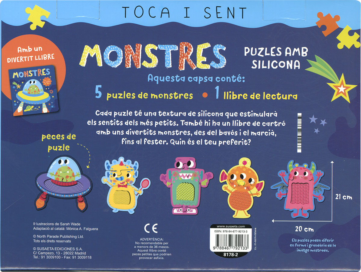 Enquadernació:  Caixa de cartró plastif. brillant amb textura de silicona i nansa, llibre de cartró i 5 puzles amb t