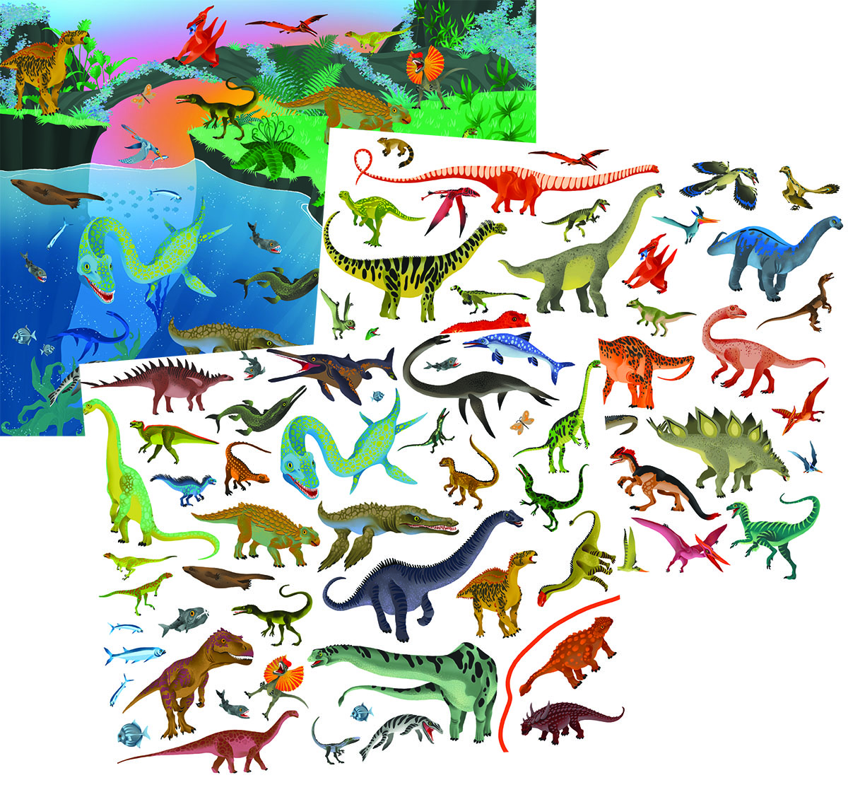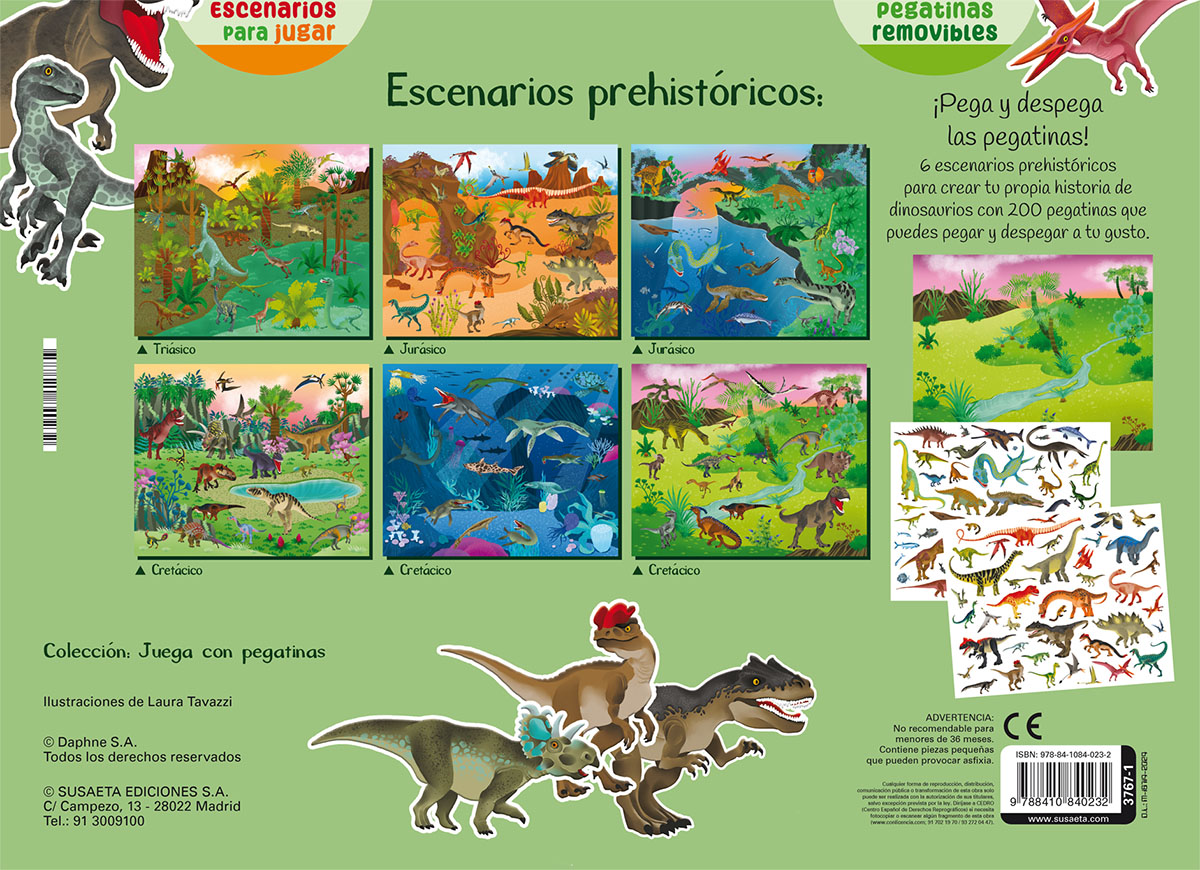 Este libro incluye seis escenarios prehistóricos para crear tu propia historia de dinosaurios y 200 pegatinas que puedes pegar y despegar para utilizar de nuevo.