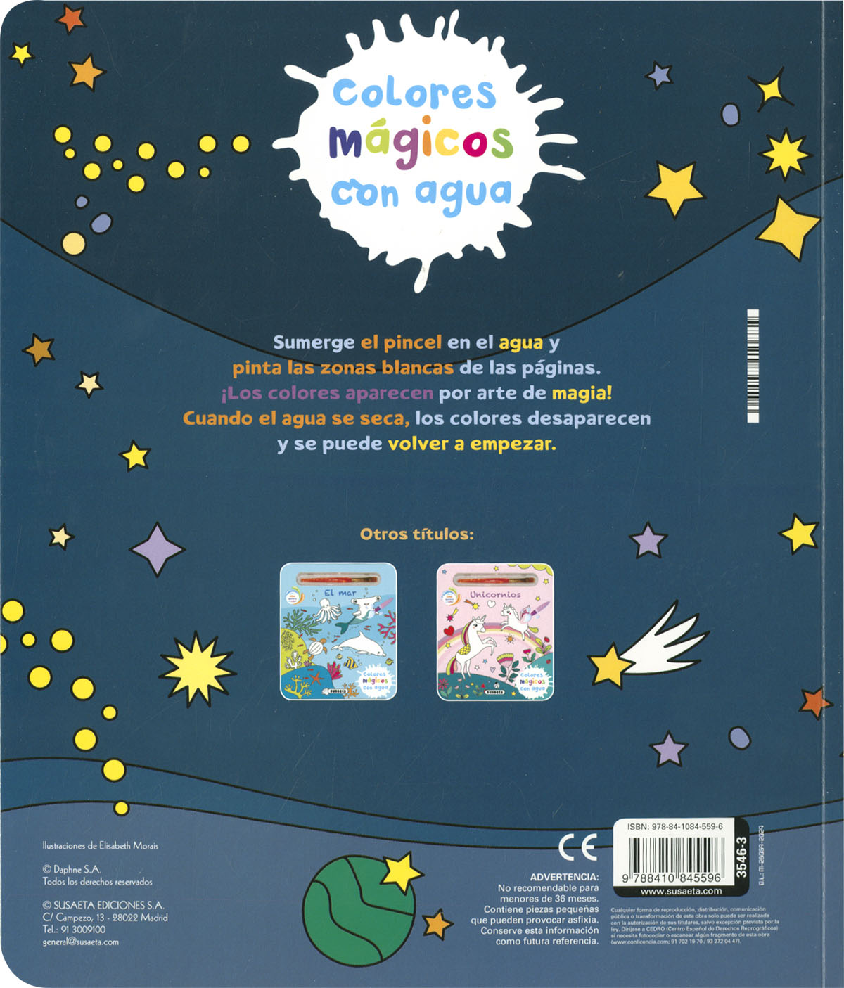 Sumerge el pincel en el agua y pinta las zonas blancas de las escenas espaciales. ¡Los colores aparecen por arte de magia! Cuando el agua se seca, los colores desaparecen y se puede volvSumerge el pincel en el agua y pinta las zonas blancas de las escenas marinas. ¡Los colores aparecen por arte de magia! Y, cuando el agua se seca, los colores desaparecen y se puede volver a empezar. Un libro de cartón para colorear con agua que ¡os volverá locos!