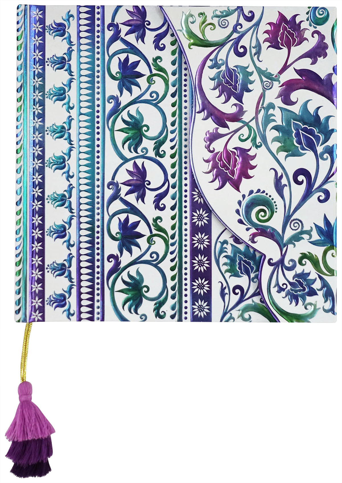 Encuadernación:  Cartoné con relieve sobre laminado plata, cierre con solapa magnética y marcapáginas con borla