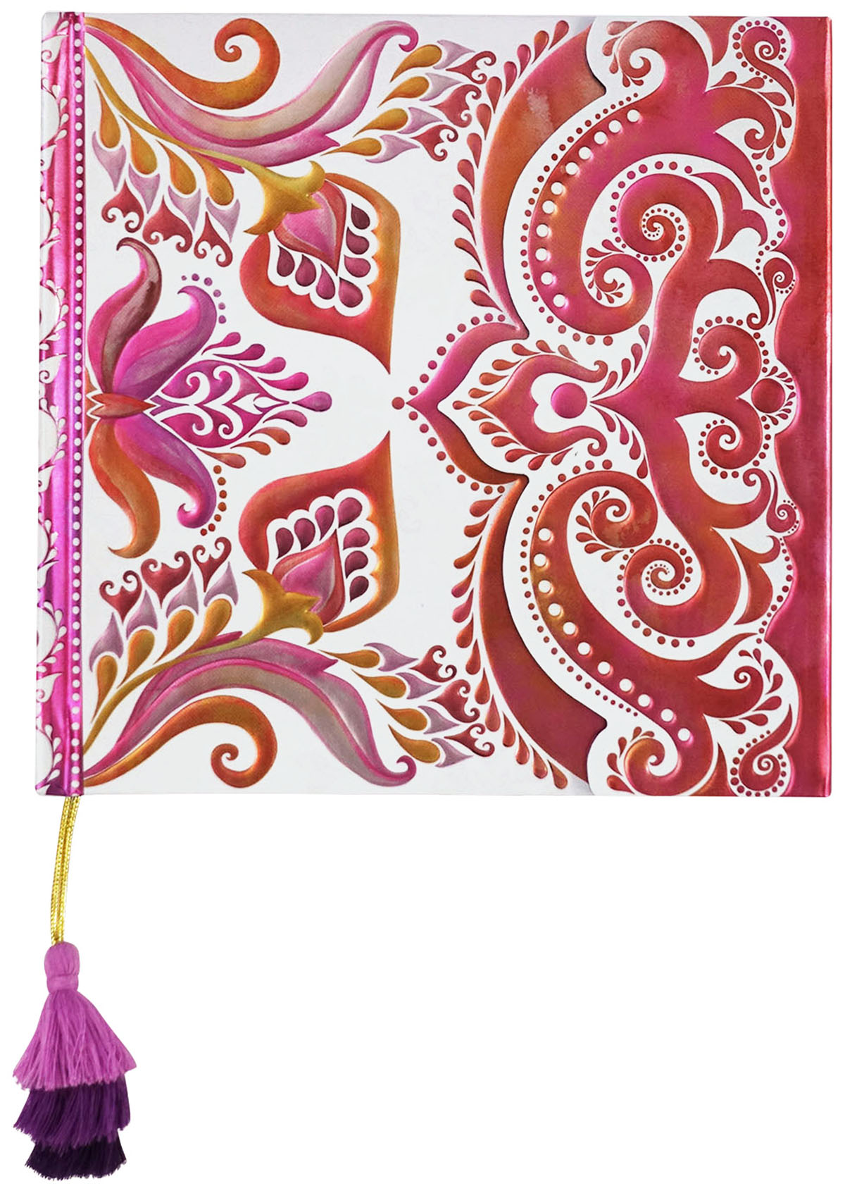 Encuadernación:  Cartoné con relieve sobre laminado plata, cierre con solapa magnética y marcapáginas con borla